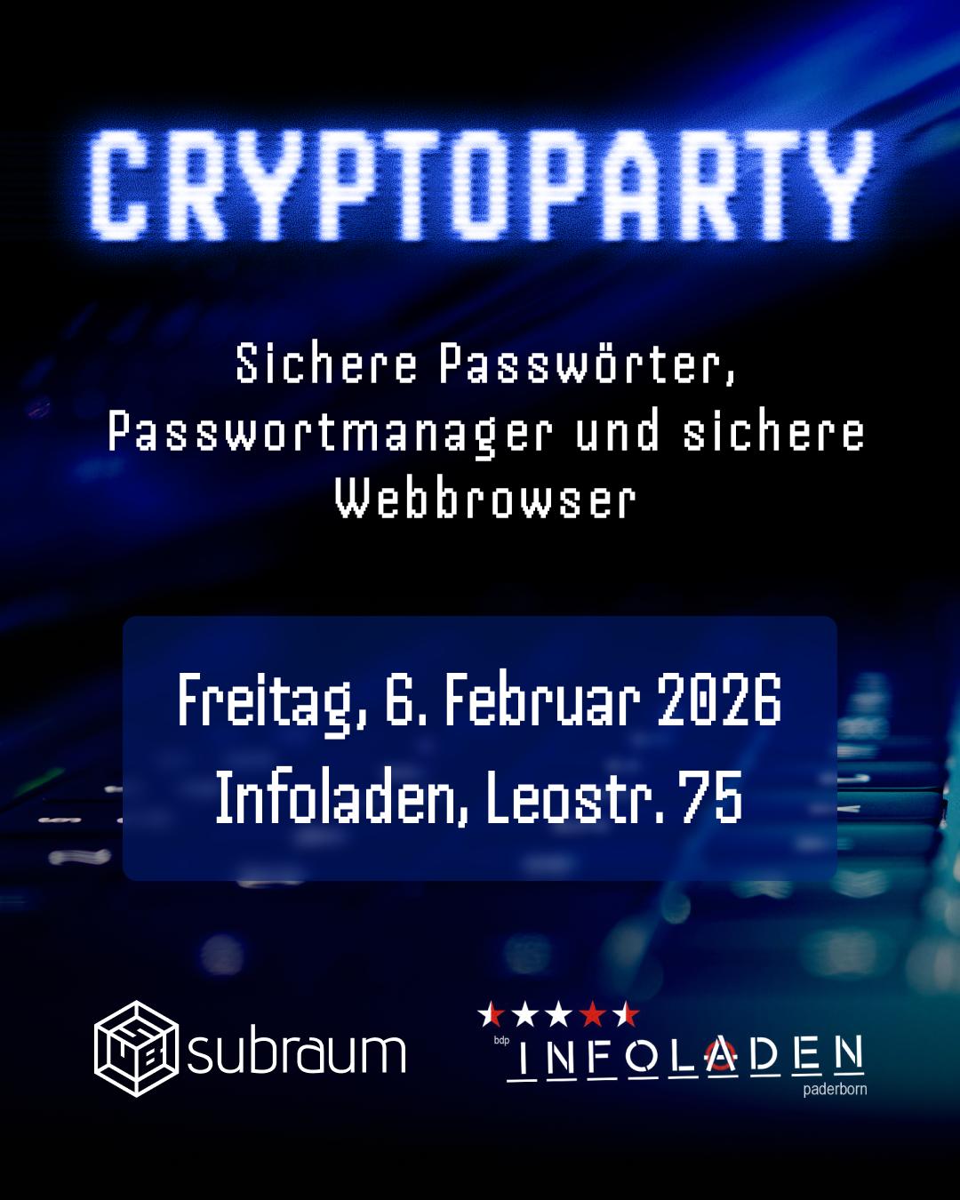 Eine Cryptoparty ist ein kostenloses, dezentrales Treffen, bei dem Menschen zusammenkommen und sich in lockerer Atmosphäre zu digitaler Selbstverteidigung austauschen. Wie man E-Mails verschlüsselt, privat surft, Festplatten verschlüsselt und generell die eigene Privatsphäre im Internet schützt. Der Fokus liegt auf vertrauenswürdiger Open-Source Software.