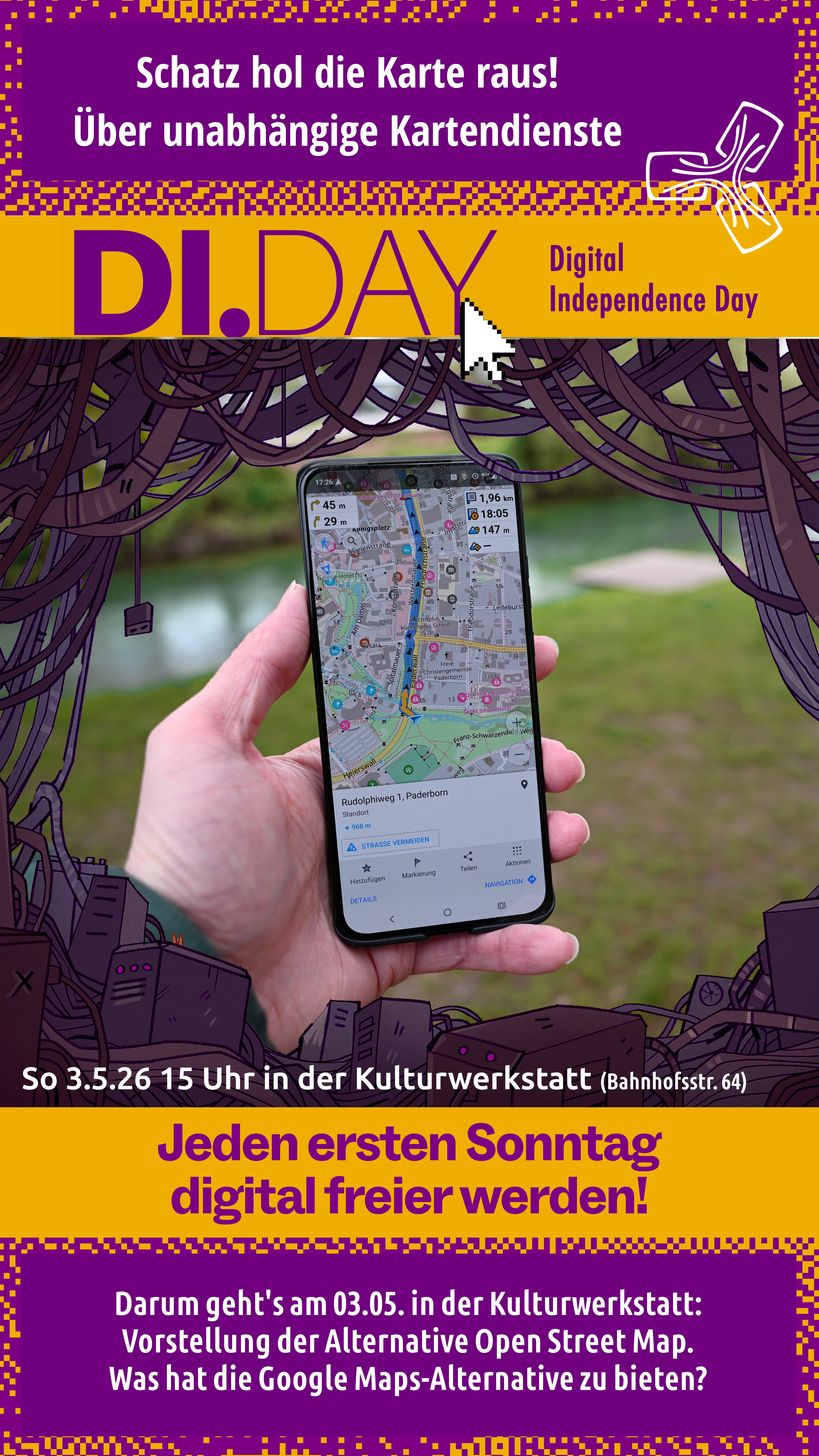 Am Sonntag, den 03.05.2026 um 15:00 Uhr treffen wir uns in der Kulturwerkstatt (Gruppenraum 3, Bahnhofstraße 64, 33102 Paderborn), um euch den Dienst Open Street Map sowie ein paar nützliche Tipps und Tricks im Umgang mit Kartendiensten zu zeigen.